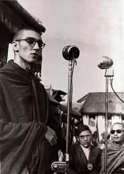 Comme Raj Kapoor (le célèbre producteur, réalisateur et acteur indien que Sangharakshita avait rencontré peu avant), Ambedkar avait une question à me poser, mais contrairement à Raj Kapoor, il me la posa sans détours et sans du tout essayer de me charmer. « Pourquoi votre Maha Bodhi Society a-t-elle un président qui est un brahmane bengali ? », me demanda-t-il d'un ton belligérant. Je lui répondis que ce n'était pas ma Maha Bodhi Society. Je faisais ce que je pouvais pour l'aider, parce que c'était la principale organisation bouddhiste de l'Inde, mais je n'étais en fait pas membre de cette organisation et n'étais pas plus heureux qu'il ne semblait l'être qu'elle ait un brahmane bengali à sa tête. (Le brahmane en question était le Dr Shyamaprasad Mookerjee, qui avant d'être le président de la Maha Bodhi Society avait été président du Mahasabha Hindou, une organisation de droite d'hindous de caste, principale opposante à la loi d'Ambedkar sur le code hindou). Mon explication ayant satisfait le leader des hors-castes, il ne s'écoula pas longtemps avant que la conversation ne se tourne vers le bouddhisme.